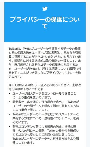 2018年4月26日記 今朝がたTwitterよりこのようなメールが届きました。 ※抜粋です。全文ではありません。 私も仕事で利用規約を度々更新しますので、SNSの利用規約もよくある事だと認識しています。ただ、スマホ端末に表示される以下の画面が結構ヘビーな感じ…